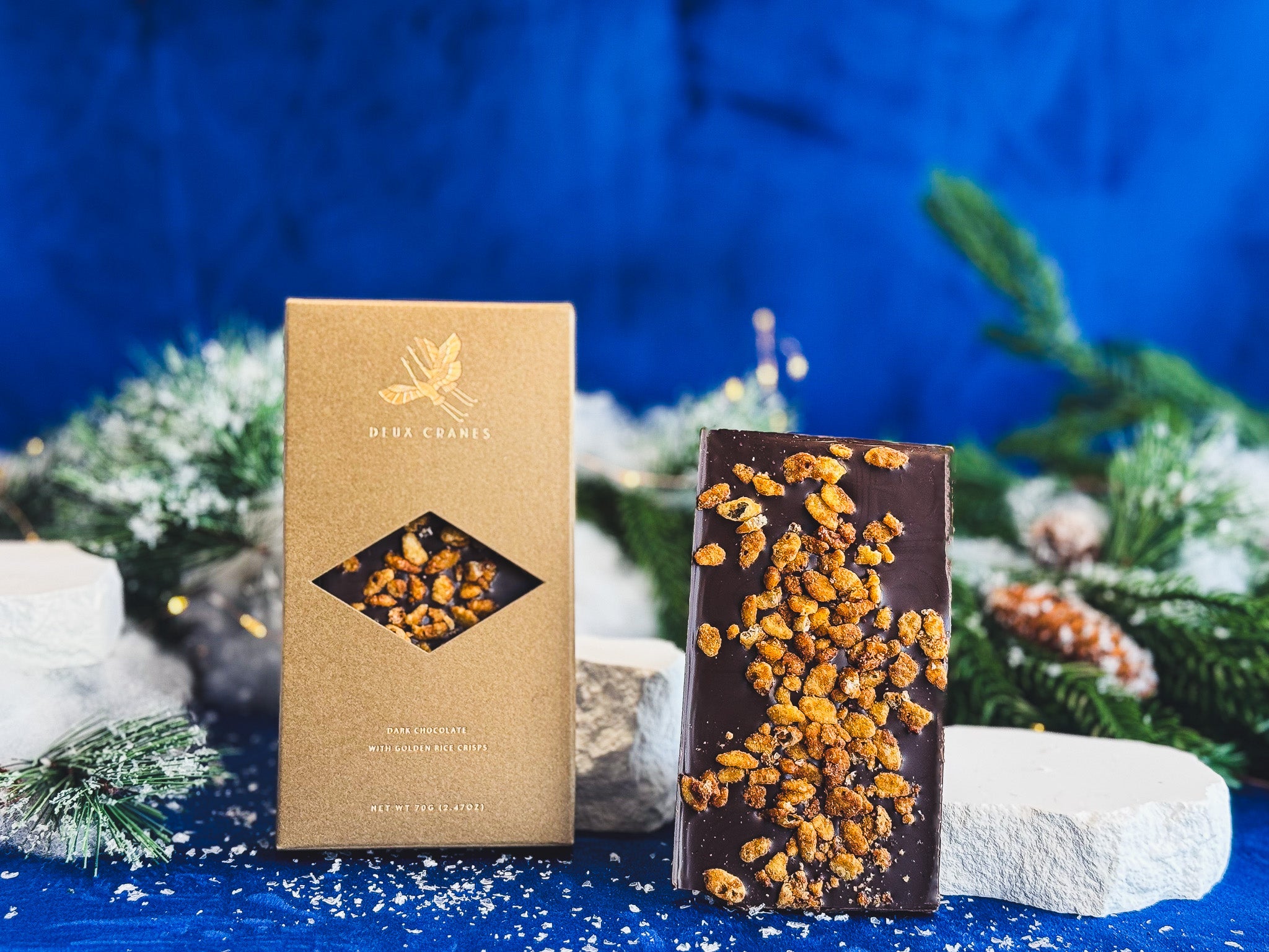 Rich 70% dark chocolate embraces golden caramelized rice crisps kissed with butter and sea salt. The deep complexity of premium cocoa meets the sweet depth of Okinawa black sugar, creating layers of texture and flavor in every bite.