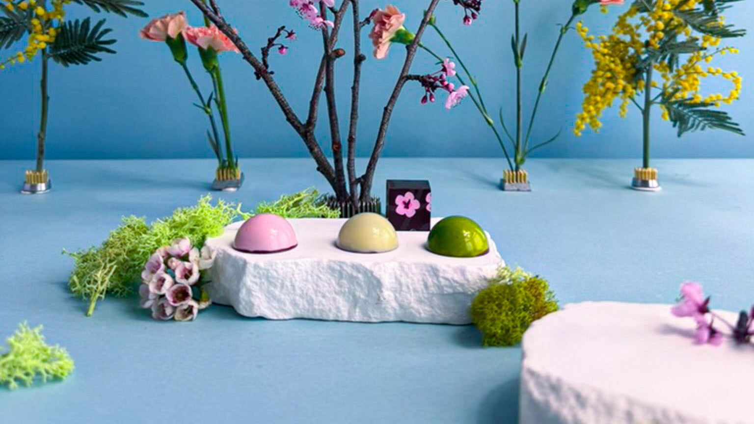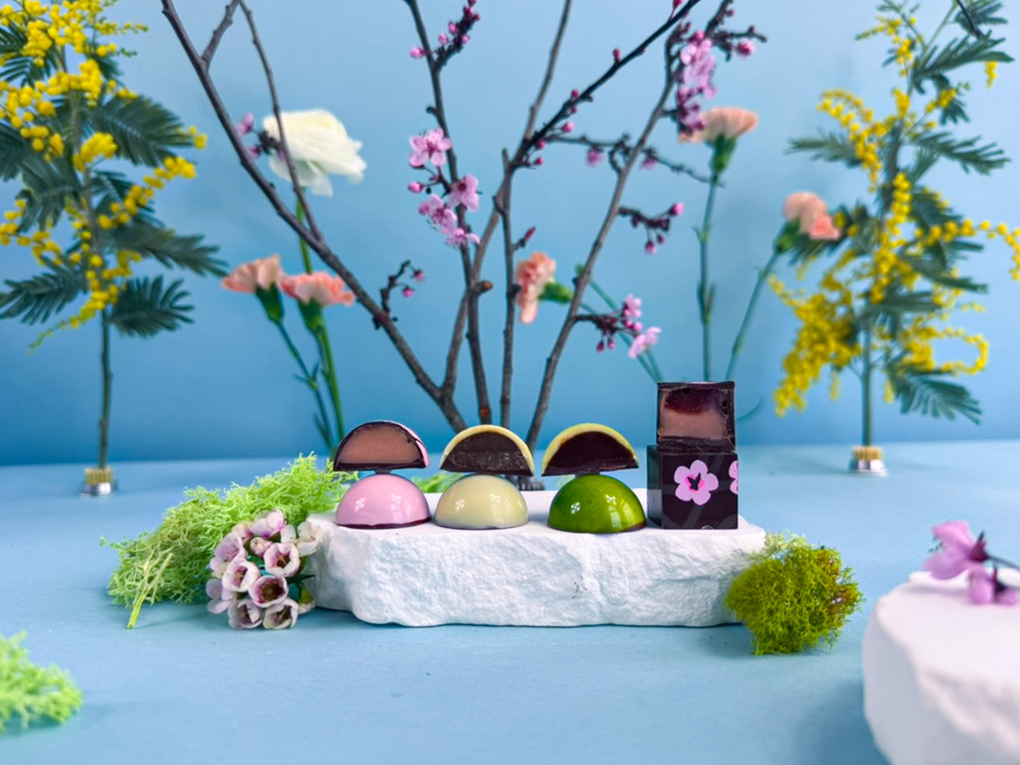 Sakura-Strawberry Bonbon A bright, floral ganache blending cherry blossom and fresh strawberry milk |